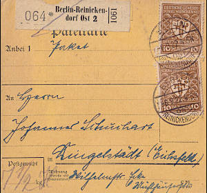 Inlandspaketkarte (7 500 g, > 75 km) vom 06.09.1922 frankiert mit 2 Marken a 10 Mark (=20 Mark) |