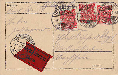 Inland postcard with special delivery from 08.11.1922 franked with 3 stamps a 3 Mark (=9 Mark, 3 postcard 6 special delivery)