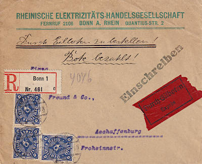 Inlandsbrief mit Einschreiben und Eilzustellung (21-100 g) vom 27.10.1922 frankiert mit 3 Marken a 6 Mark (=18 Mark, 8 Brief 4 Einschreiben 6 Eilzustellung) |