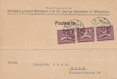 Local postcard from 09.10.1922 franked with 3 stamps a 50 Pfennig (=1,50 Mark)