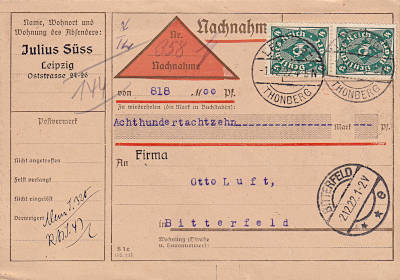 Inlandsdrucksache mit Nachnahme (1-25 g) vom 01.12.1922 frankiert mit 2 Marken a 4 Mark (=8 Mark, 2 Drucksache 6 Nachnahme)