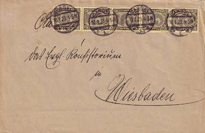 Inlandsbrief (1-20 g) vom 10.01.1923 frankiert mit 5 Marken a 5 Mark (=25 Mark)