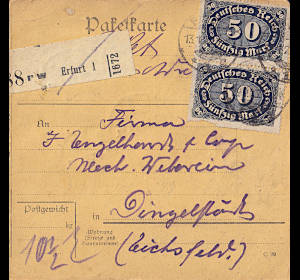 Inlandspaketkarte (3 000 g, > 75 km) vom 13.01.1923 frankiert mit 2 Marken (=250 Mark) |