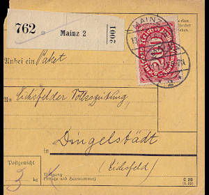 Inlandspaketkarte (1 500 g, < 75 km) vom 22.12.1922 frankiert mit 16 Marken (=125 Mark) |