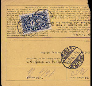 Inlandspaketkarte (4 000 g, < 75 km) vom 19.12.1922 frankiert mit 5 Marken (=125 Mark) |