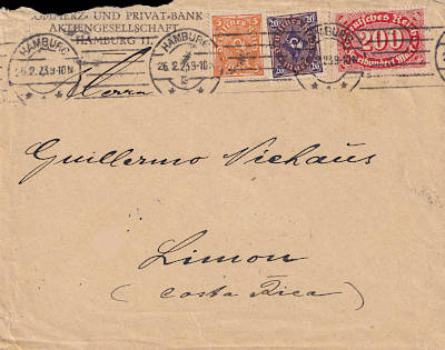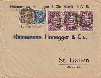 Auslandsbrief (1-20 g) vom 28.01.1923 frankiert mit 3 Marken a 50 Mark (=150 Mark)