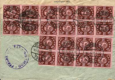 Inlandsbrief mit Einschreiben (1-20 g) vom 16.01.1923 frankiert mit 12 Marken (=90 Mark, 50 Brief 40 Einschreiben) |