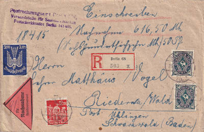 Inlandsbrief mit Einschreiben und Nach-nahme (1-20 g) vom 26.01.1923 frankiert mit 4 Marken (=115 Mark, 50 Brief 40 Einschreiben 25 Nachnahme)