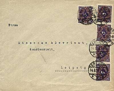 Inlandsbrief (1-20 g) vom 14.03.1923 frankiert mit 5 Marken a 20 Mark (=100 Mark) |