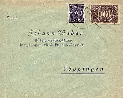 Inlandsbrief (1-20 g) vom 07.03.1923 frankiert mit 2 Marken a 50 Mark (=100 Mark) |