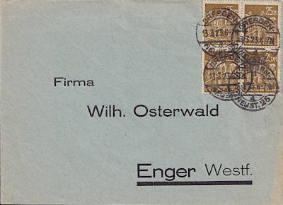 Inlandsbrief (1-20 g) vom 13.03.1923 frankiert mit 4 Marken a 25 Mark (=100 Mark) |