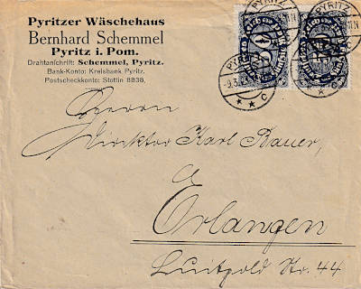 Inlandsbrief (1-20 g) vom 09.03.1923 frankiert mit 2 Marken a 50 Mark (=100 Mark) |