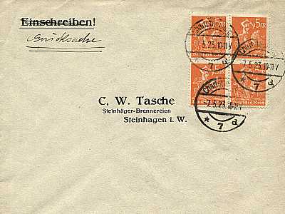 Inlandsdrucksache (1-25 g) vom 07.05.1923 frankiert mit 4 Marken a 5 Mark (=20 Mark) |