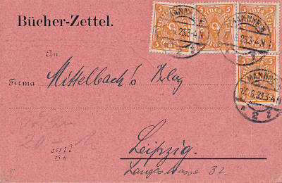 Inlandsbücherzettel (1-25 g) vom 17.06.1923 frankiert mit 4 Marken a 5 Mark (=20 Mark) |