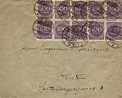 Auslandsbrief (1-20 g) vom 07.08.1923 frankiert mit 10 Marken a 100 Mark(=1 000 Mark)