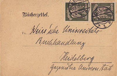 Inlandsbücherzettel (1-25 g) vom 08.08.1923 frankiert mit 2 Marken a 100 Mark(=200 Mark)