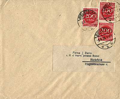 Ortsbrief (1-20 g) vom 22.08.1923 frankiert mit 2 Marken a 200 Mark (=400 Mark) |
