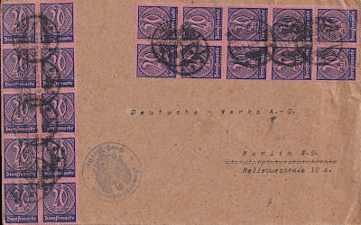 Ortsbrief (1-20 g) vom 14.08.1923 frankiert mit 20 Marken a 20 Mark (=400 Mark) |
