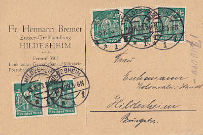 Ortspostkarte vom 23.08.1923 frankiert mit 4 Marken a 50 Mark (=200 Mark)