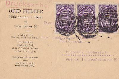 Auslandsdrucksache (1-50 g) vom 31.08.1923 frankiert mit 4 Marken a 3 000 Mark (=12 000 Mark)