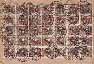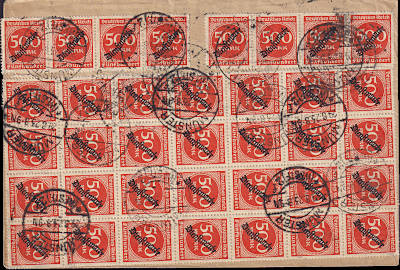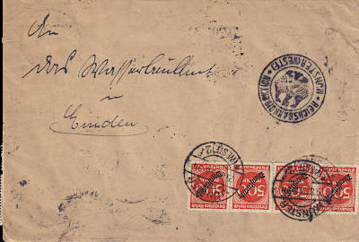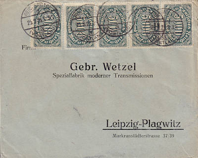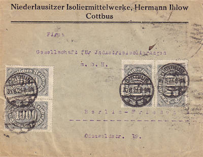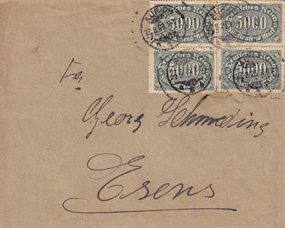 Inlandsbrief (1-20 g) vom 27.08.1923 frankiert mit 4 Marken a 5 000 Mark (=20 000 Mark) |