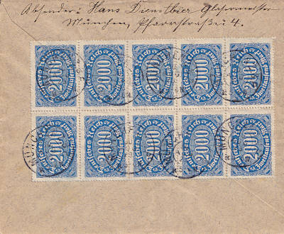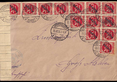 Inlandsbrief (1-20 g) vom 28.08.1923 frankiert mit einer Marke a 20 000 Mark auf 200 Mark (=20 000 Mark) |