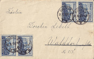 Inlandsbrief (1-20 g) vom 31.08.1923 frankiert mit 4 Marken a 5 000 Mark (=20 000 Mark) |