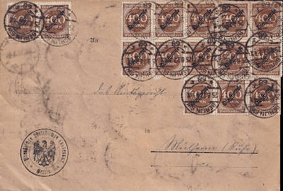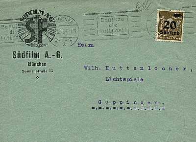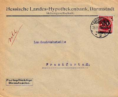 Inlandsbrief (1-20 g) vom 24.08.1923 frankiert mit einer Marke a 20 000 Mark auf 25 Mark (=20 000 Mark) |