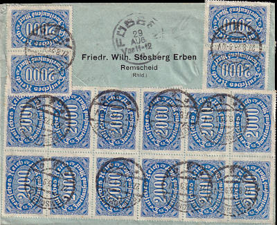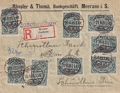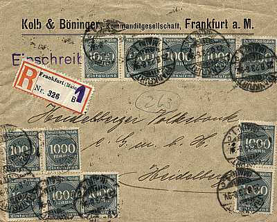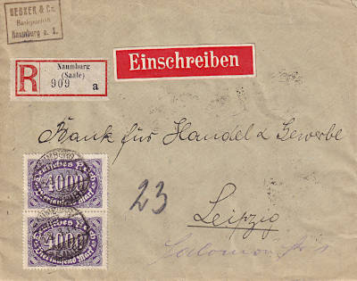 Inlandsbrief mit Einschreiben (1-20 g) vom 25.08.1923 frankiert mit 10 Marken a 4 000 Mark (=40 000 Mark, 20 000 Brief 20 000 Einschreiben) |