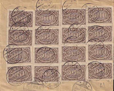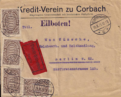 Inland cover with special delivery (1-20 g) from 29.08.1923 franked with 20 stamps a 3 000 Mark (=60 000 Mark, 20 000 cover 40 000 special delivery)