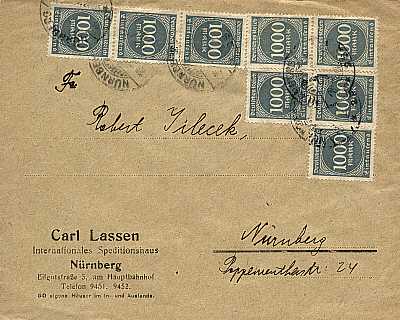 Ortsbrief (1-20 g) vom 24.08.1923 frankiert mit 8 Marken a 1 000 Mark (=8 000 Mark) |