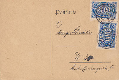 Ortspostkarte vom 28.08.1923 frankiert mit 2 Marken a 2 000 Mark (=4 000 Mark)