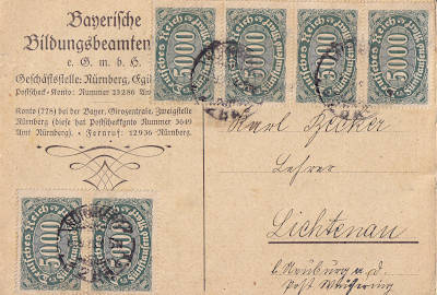 Inlandspostkarte vom 13.09.1923 frankiert mit 6 Marken a 5 000 Mark (=30 000 Mark) |