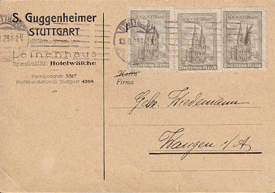 Inlandspostkarte vom 13.09.1923 frankiert mit 3 Marken a 10 000 Mark (=30 000 Mark) |