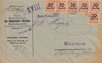 Ortszustellungsauftrag (1-20 g) vom 18.09.1923 frankiert mit 36 Marken (=135 000 Mark,30 000 Brief 75 000 Zustellung 30 000 Urkunde)