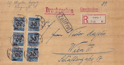 Auslandsdrucksache mit Einschreiben (501-1 000 g) vom 22.09.1923 frankiert mit 26 Marken (=625 000 Mark, 375 000 Drucksache 250 000 Einschreiben)