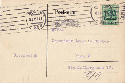 Auslandspostkarte vom 28.09.1923 frankiert mit einer Marke a 100 000 Mark auf 400 Mark (=100 000 Mark)