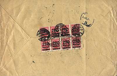 Auslandsbrief mit Einschreiben (121-140 g) vom 25.09.1923 frankiert mit 13 Marken a 250 000 Mark auf 500 Mark (=3,25 Millionen Mark, 3 Millionen Brief 250 000 Einschreiben)