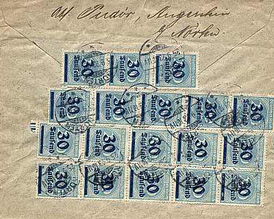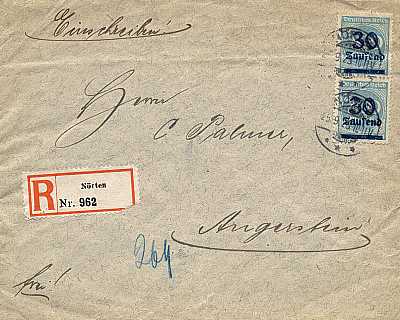 Inlandsbrief mit Einschreiben (21-100 g) vom 25.09.1923 frankiert mit 20 Marken a 30 000 Mark auf 200 Mark (=600 000 Mark, 350 000 Brief 250 000 Einschreiben) |