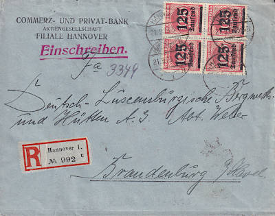 Inlandsbrief mit Einschreiben (1-20 g) vom 21.09.1923 frankiert mit 4 Marken a 125 000 Mark auf 1 000 Mark (=500 000 Mark, 250 000 Brief 250 000 Einschreiben) |