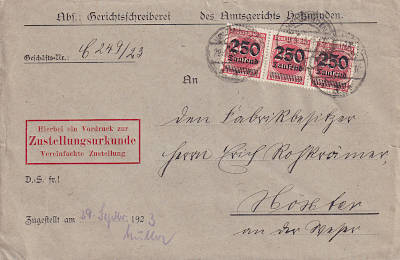 Inlandsbrief mit Zustellungsurkunde (1-20 g) vom 29.09.1923 frankiert mit 3 Marken a 250 000 Mark auf 500 Mark (=750 000 Mark, 250 000 Brief 250 000 Zustellung 250 000 Urkunde)