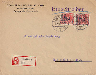 Inland cover with registeration (1-20 g) from 08.10.1923 franked with 2 stamps a 2 Million Mark on 5 000 Mark (=4 Million Mark, 2 Million cover 2 Million registeration)