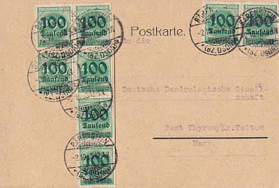 Inlandspostkarte vom 02.10.1923 frankiert mit 8 Marken a 100 000 Mark auf 400 Mark (=800 000 Mark) |