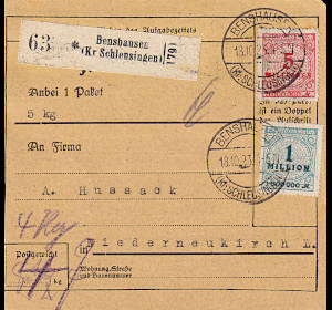 Inlandspaketkarte (4 000 g, > 75 km) vom 18.10.1923 frankiert mit 8 Marken (=36 Millionen Mark)