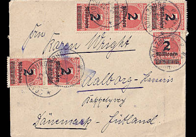 Auslandsbrief (1-20 g) vom 22.10.1923 frankiert mit 6 Marken a 5 Millionen Mark (=30 Millionen Mark) |