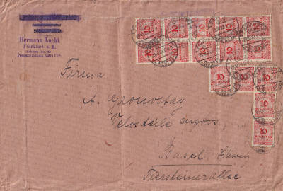 Auslandsbrief (1-20 g) vom 26.10.1923 frankiert mit 15 Marken a 2 Millionen Mark auf 200 Mark (=30 Millionen Mark) |