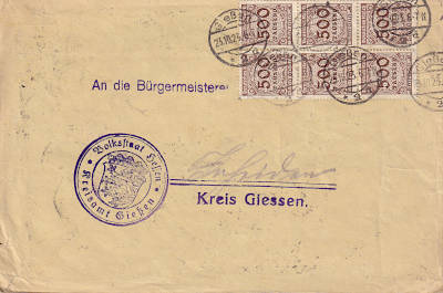 Inlandsbrief (1-20 g) vom 25.10.1923 frankiert mit 5 Marken a 2 Millionen Mark auf 200 Mark (=10 Millionen Mark) |