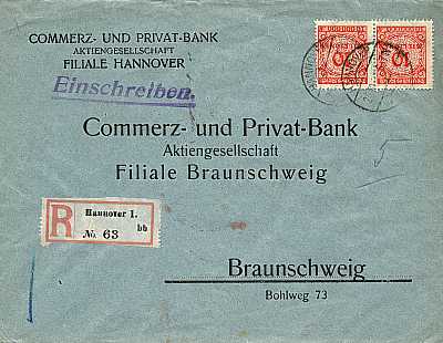 Inlandsbrief mit Einschreiben (1-20 g) vom 27.10.1923 frankiert mit 2 Marken a 10 Millionen Mark (=20 Millionen Mark, 10 Millionen Brief 10 Millionen Einschreiben) |