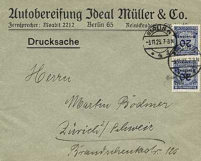 Auslandsdrucksache (1-50 g) vom 03.11.1923 frankiert mit 2 Marken a 20 Millionen Mark (=40 Millionen Mark)