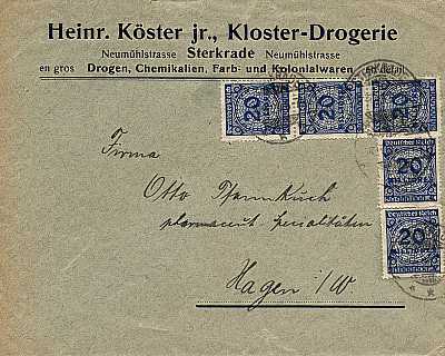 Inlandsbrief (1-20 g) vom 04.11.1923 frankiert mit 20 Marken a 5 Millionen Mark